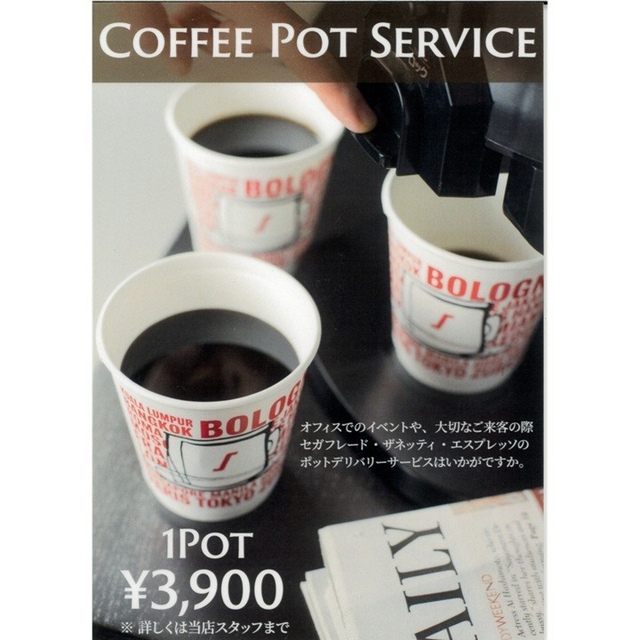 ※1ポットの容量はピッコロサイズで約10杯分です。 ※紙カップ、お砂糖、ポーションミルクをお付けいたします。 セガフレード・ザネッティ・エスプレッソ東京オペラシティ店 ☏ 03-6383-3527